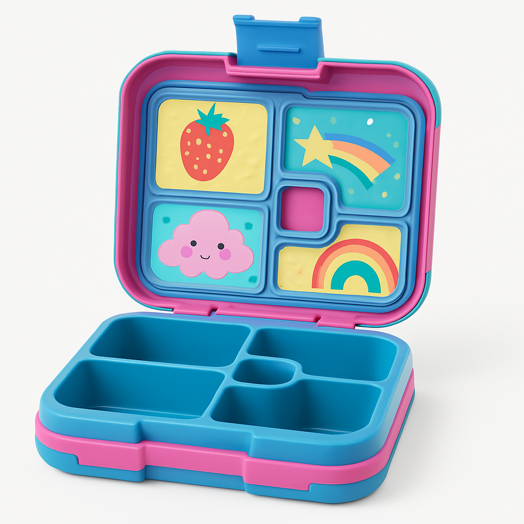 5-compartment bento box with drop-proof, rubber-edged design. Bright colours kids love.